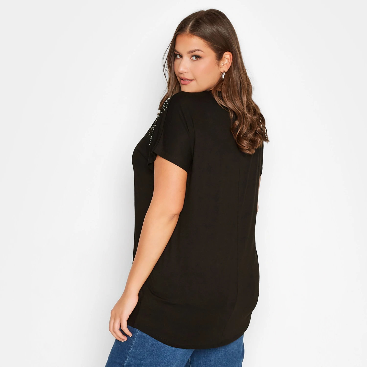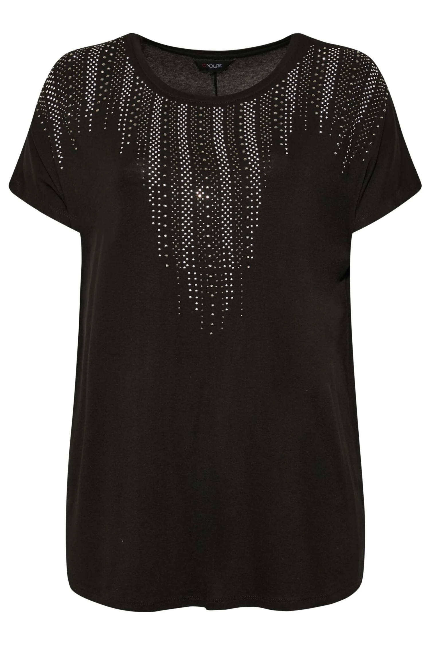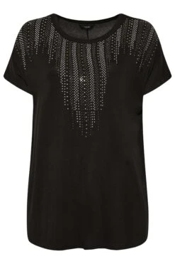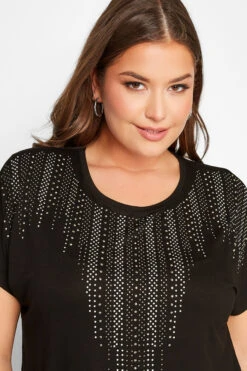 Amp up your new season wardrobe with this stud embellished top. Made from a comfortable jersey fabric, it features a studded neckline, short grown on sleeves and a scoop neckline. Team with jeans and heels for a look that is perfect for dinner and drinks.