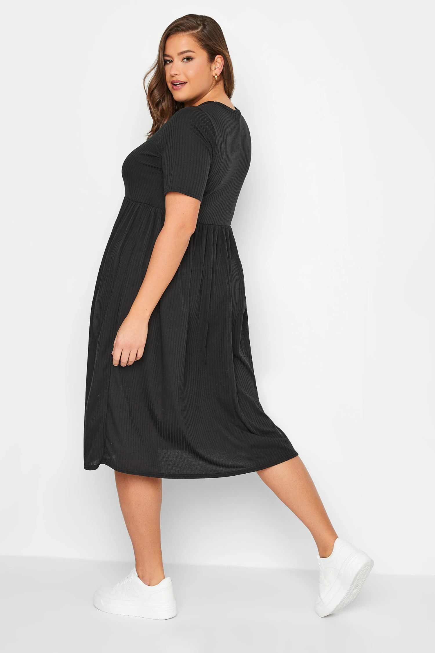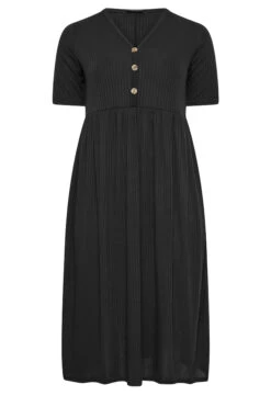 The perfect casual piece. This Limited Collection curve midi dress features short sleeves and a v-neckline with button details, finished in a flattering peplum style. Slip-on with trainers and a denim jacket for chic everyday styling.