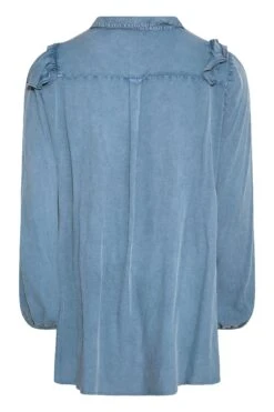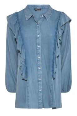 Get your hands on this frill chambray shirt! Comfortable in a lightweight woven material it features, balloon sleeves, a button-through fastening, and a dipped hem. Pair with coated leggings and boots for a style ideal for layering.