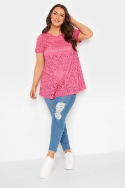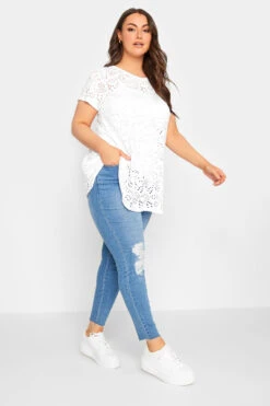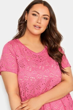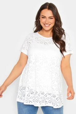 Stay on trend this season with the new plus size broderie tops. Made from a comfortable jersey fabric these tops feature a v-neckline, a broderie design, and a swing style. Wear with jeans and trainers for a look you can wear with confidence.