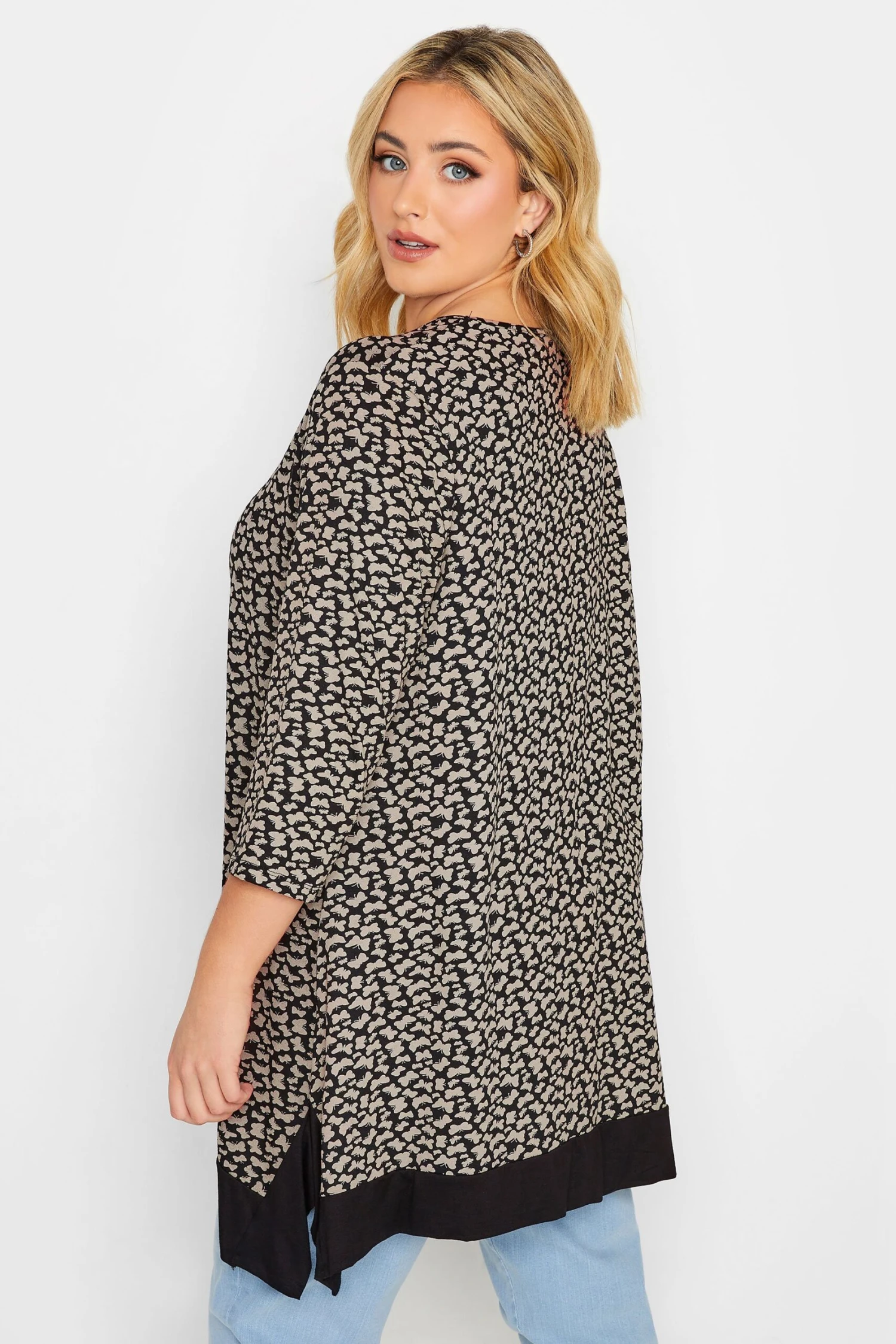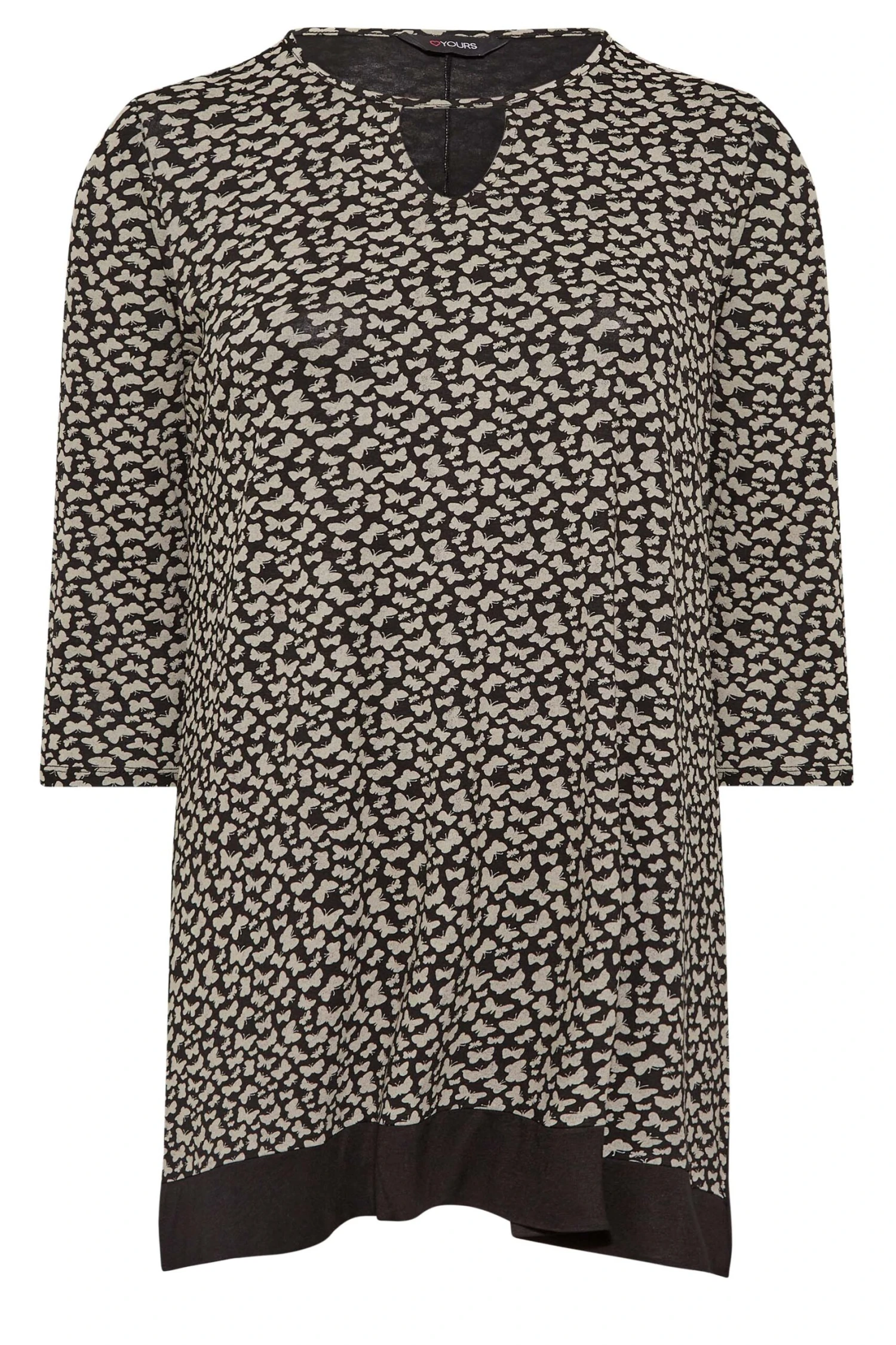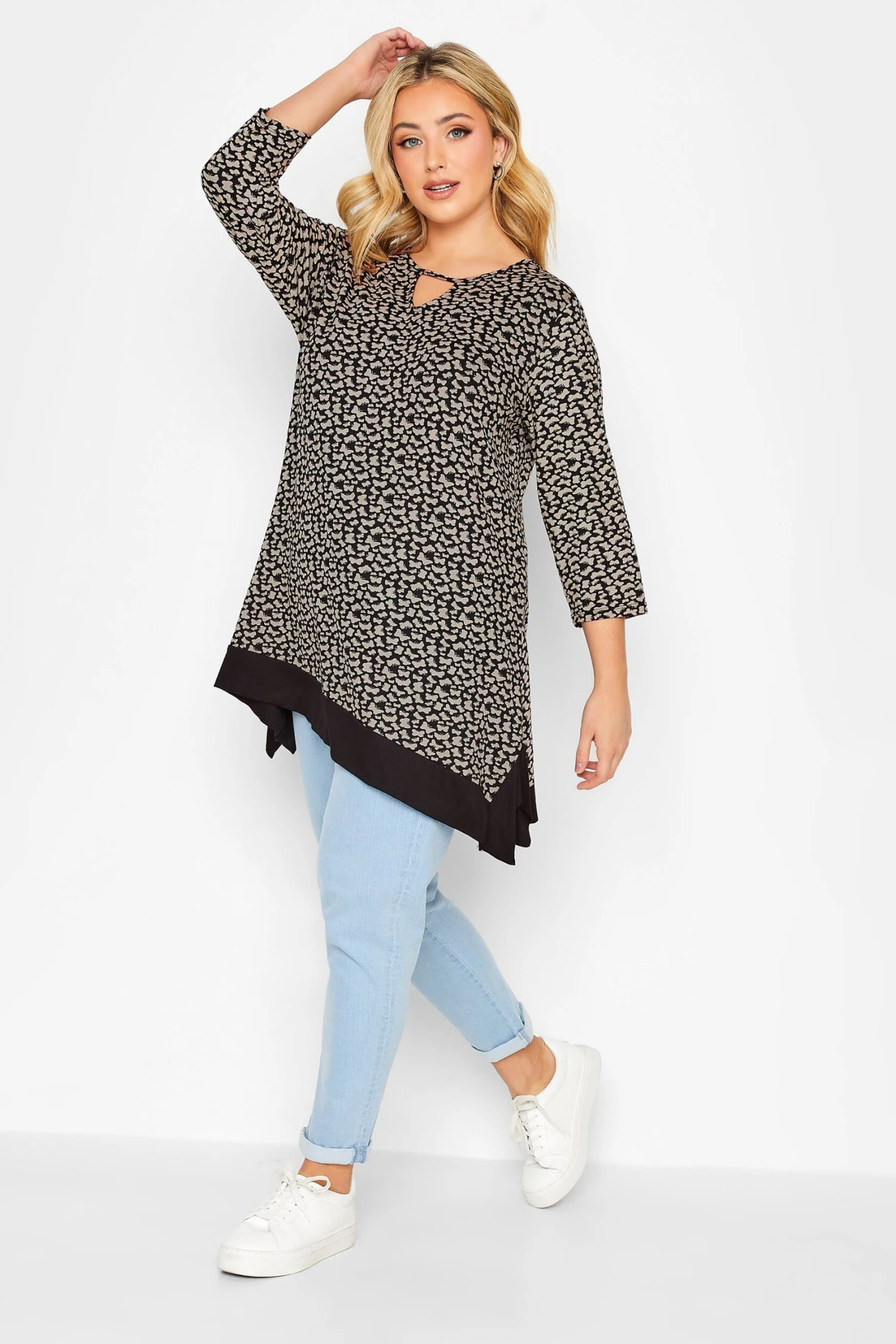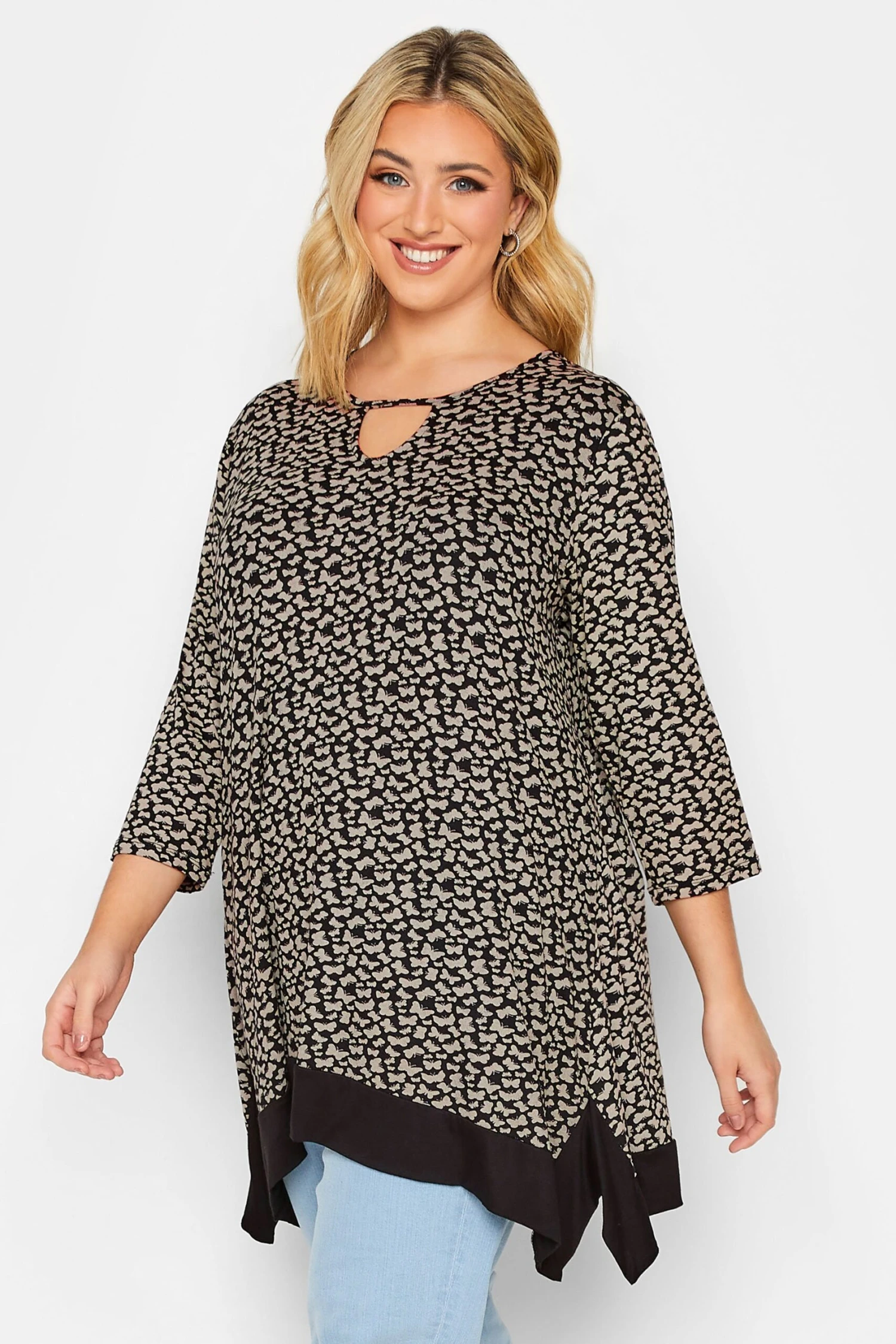 This new-in hanky hem top is ready and waiting for your weekend plans. Made from a comfortable jersey fabric, it features a butterfly print with 3/4 length sleeves and a notch neckline. Team with jeans and boots for a look that is perfect for everyday wear.