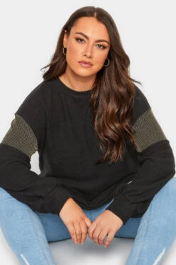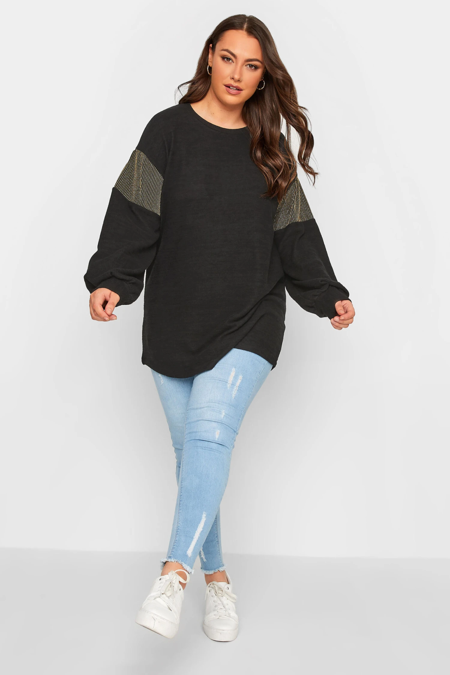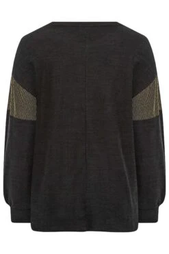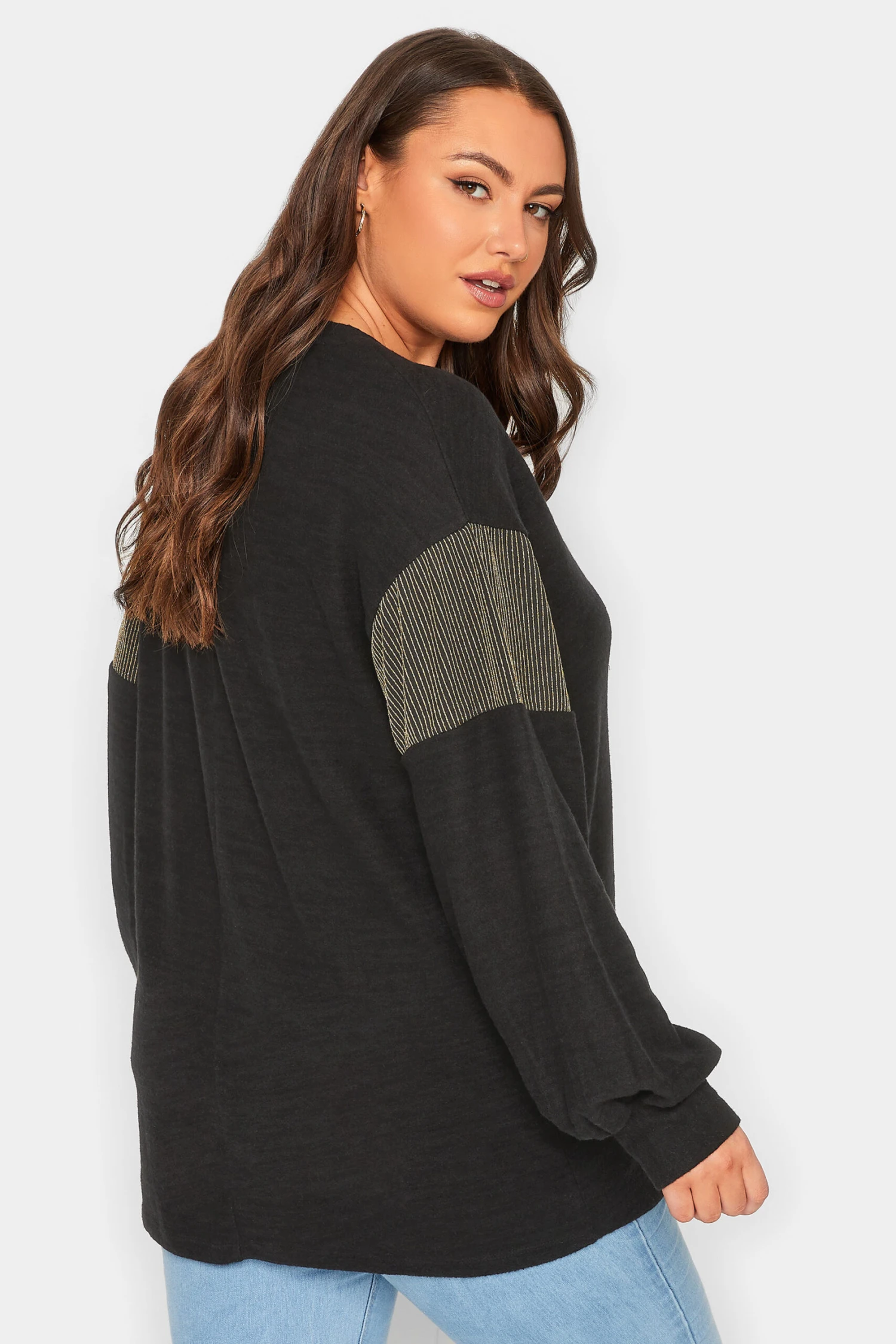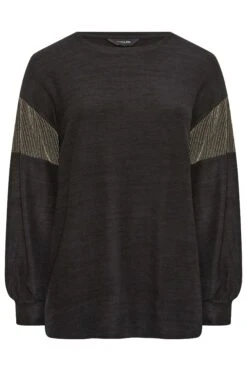 Treat yourself to this new-in soft touch top. Made from a soft jersey fabric, it features long sleeves, a scoop neckline, and glitter sleeve panels. Complete the look with leather look leggings and boots for a casual, yet stylish outfit.