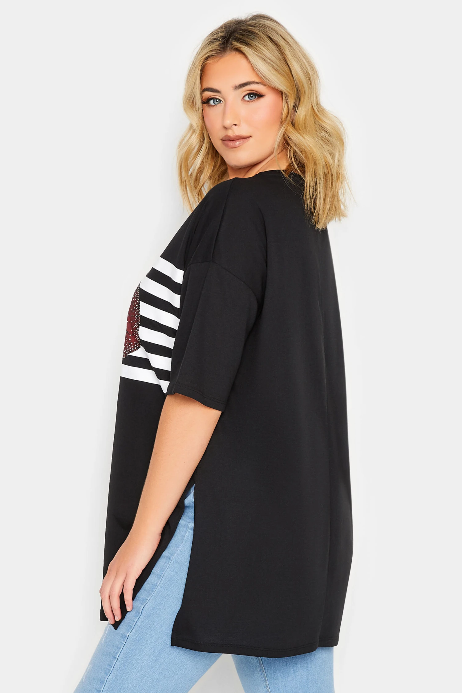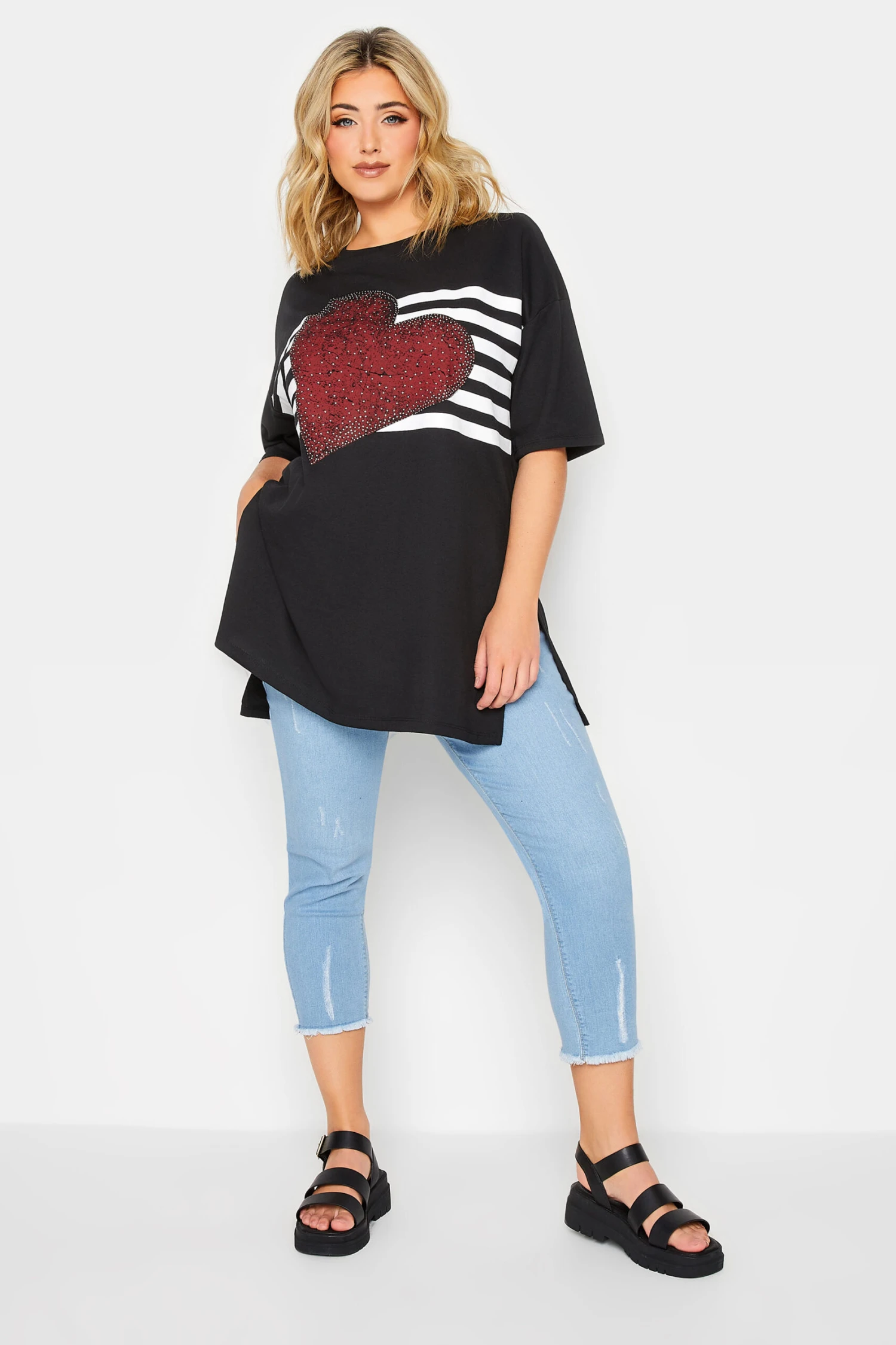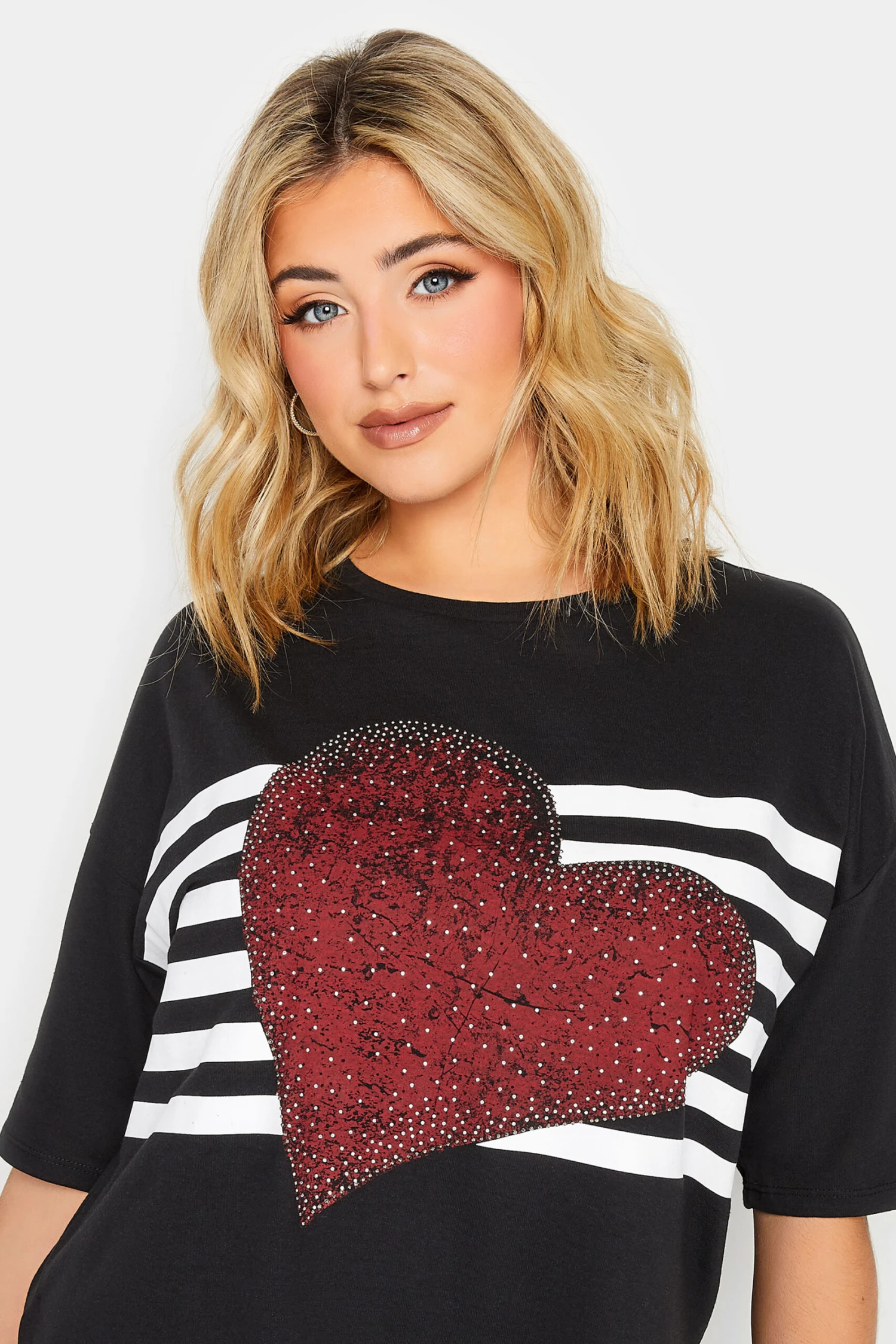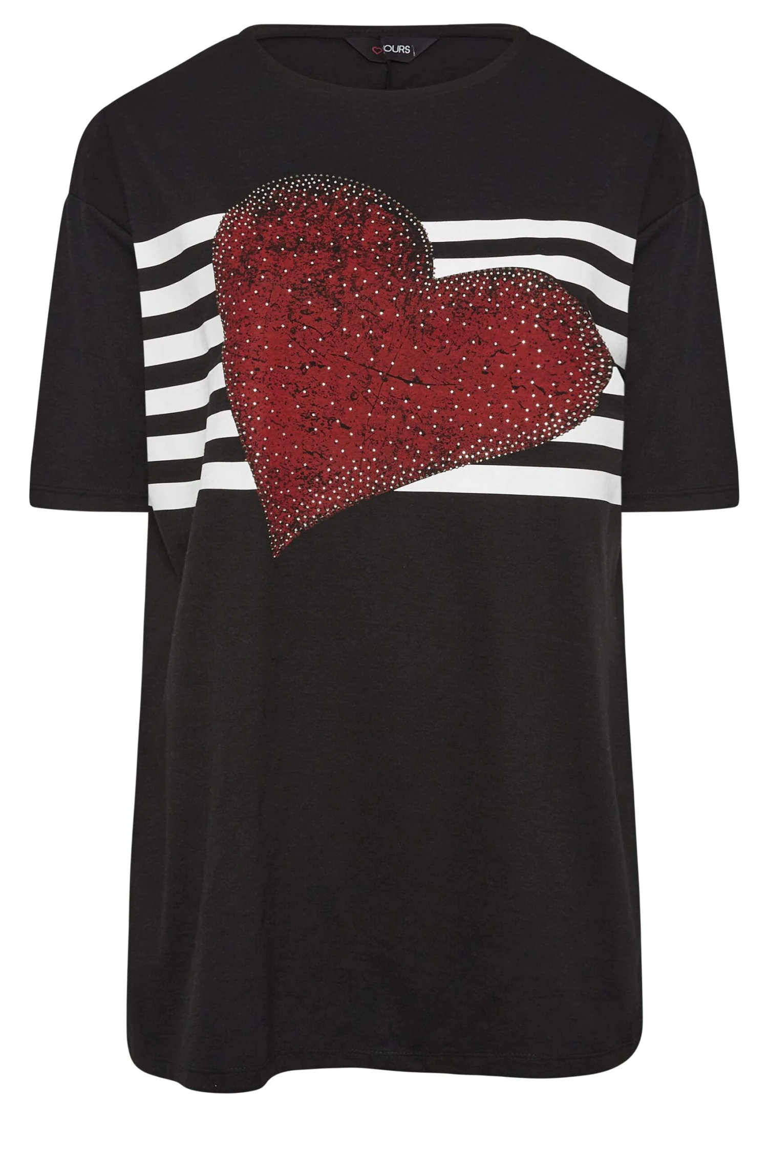 Refresh your graphic t-shirt collection with this new-in tee. Made from a soft cotton blend, it features a heart stripe print with diamante embellishment, short sleeves, and a scoop neckline, complete with a side split hem. Style with jeans and trainers for a casual everyday outfit.