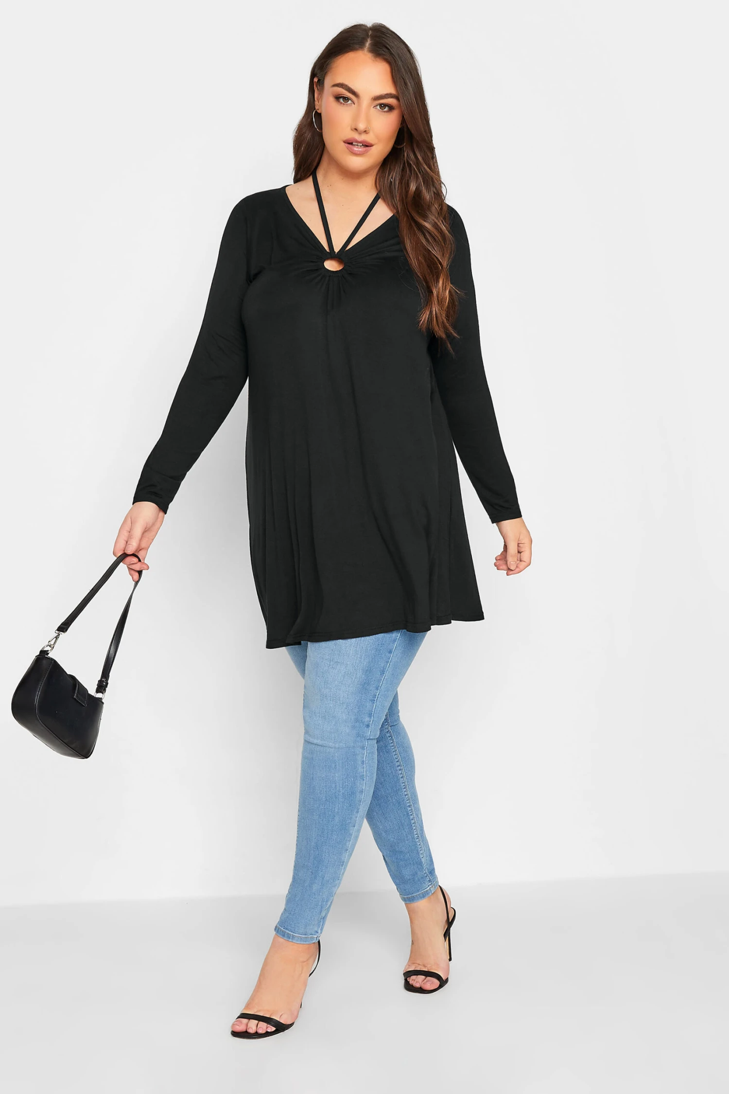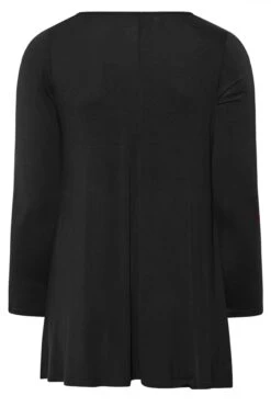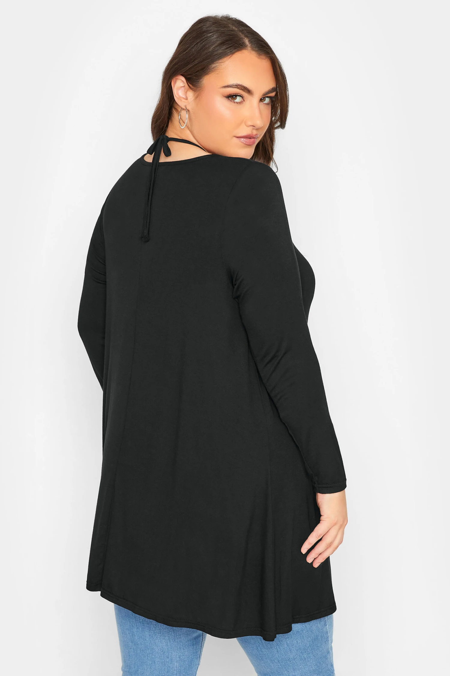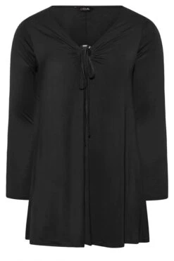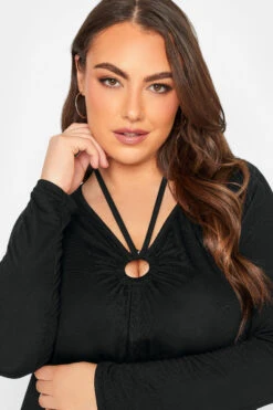 Wondering what to wear this weekend? Why not try this new-in plus size black swing top. Made from a comfortable jersey fabric, it features a ring detail and a tie neck fastening. Team with jeans and heels for a look that is perfect for dinner and drinks.