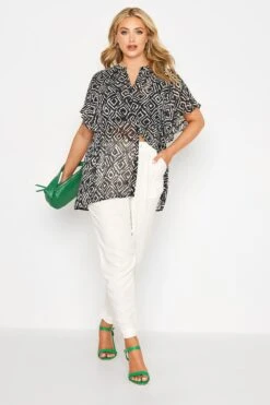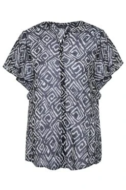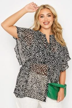 This new-in geometric shirt was made for your weekend plans! Made from a sheer woven fabric, it features short frilly sleeves with button through fastenings. Style with jeans and pumps for a day look, or with heels and a shoulder bag for your evening plans.