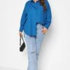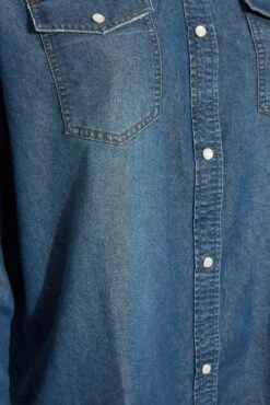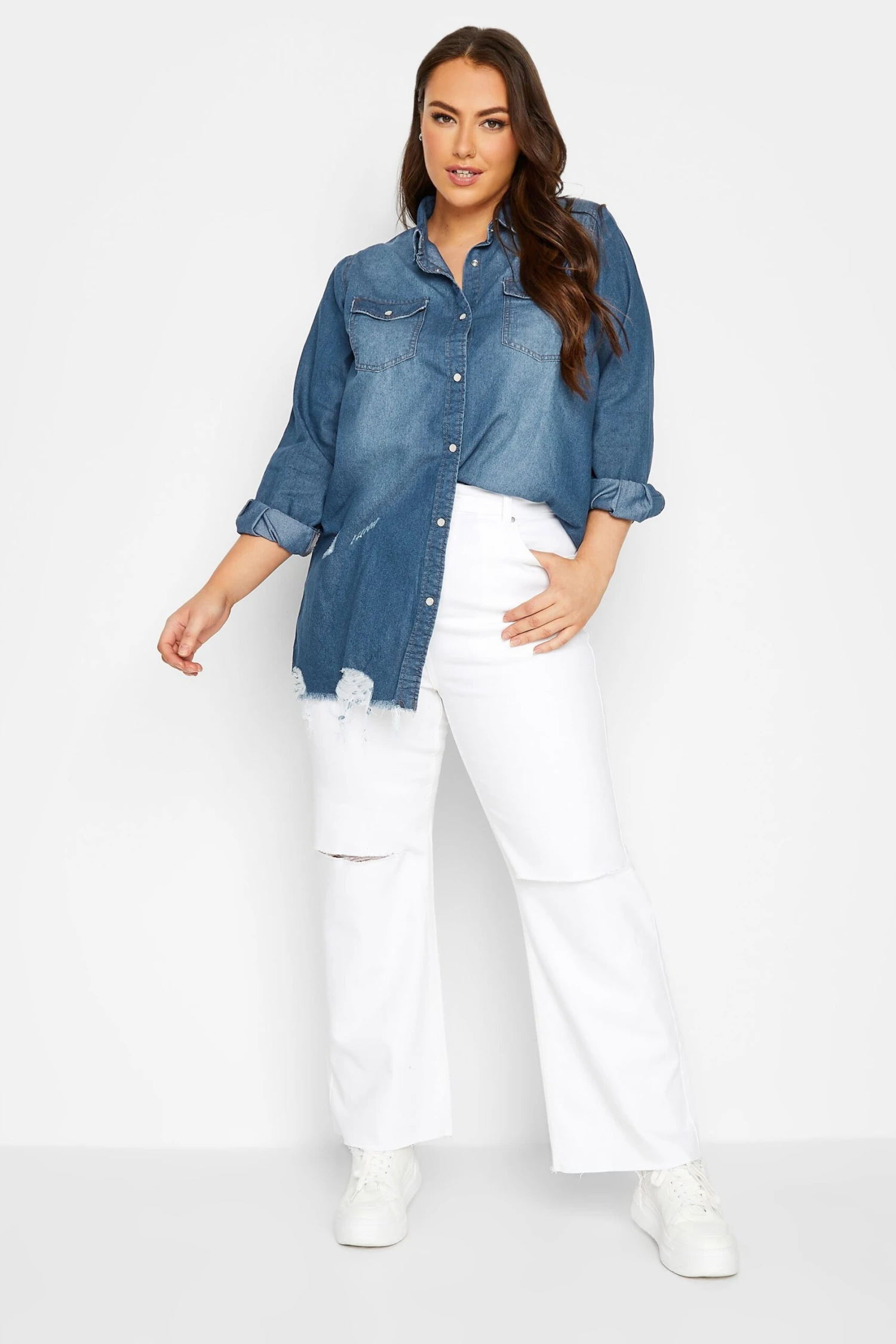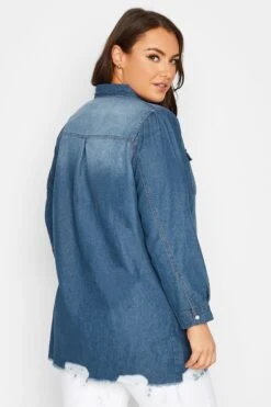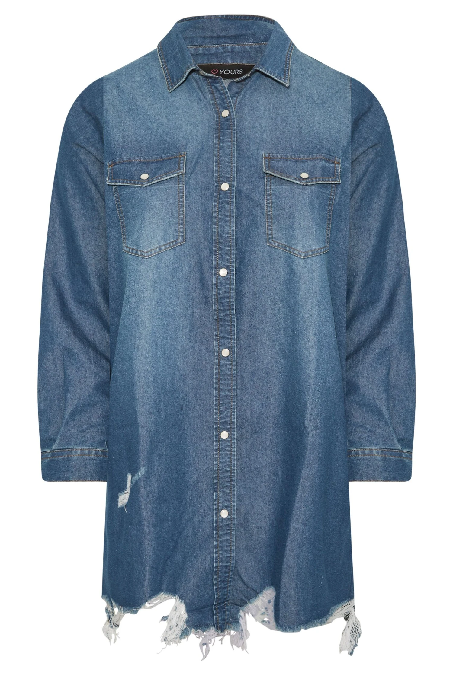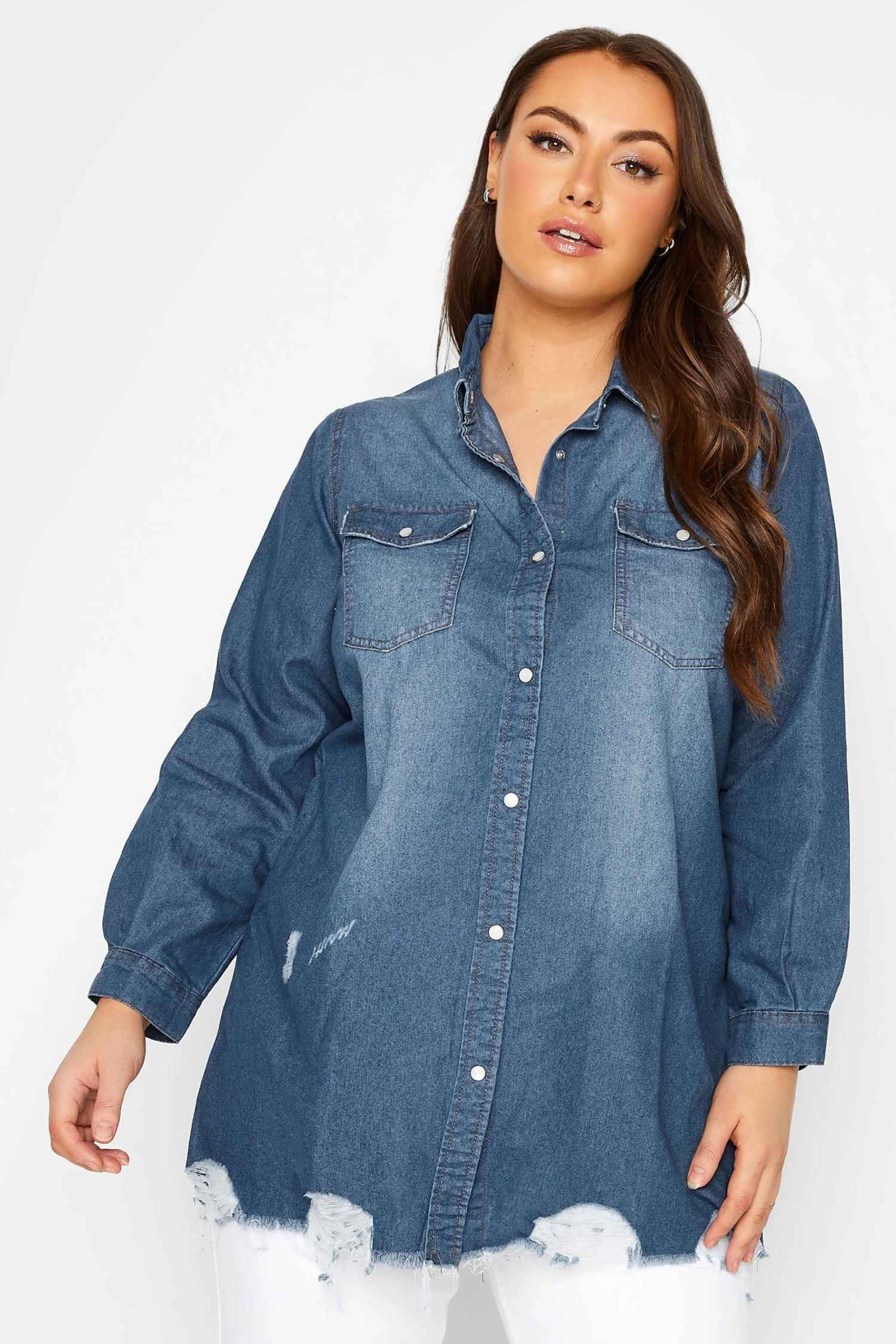Level up your denim collection with this distressed denim shirt. Made from a soft woven fabric, this plus size denim shirt features functional chest pockets and a classic collar. Layer over a t-shirt and jeans for an effortless off-duty look.