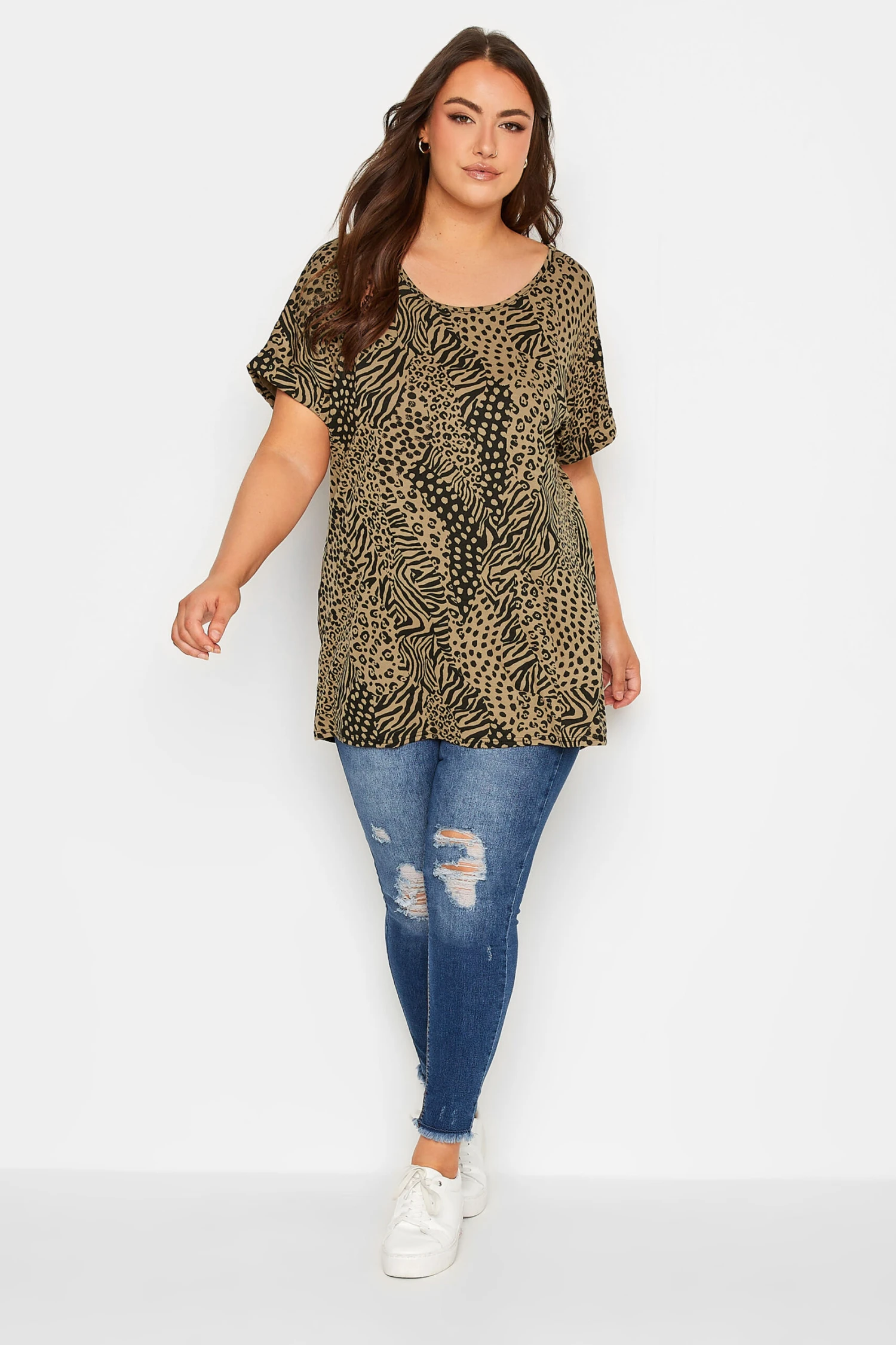 Every collection needs an animal print t-shirt! This one features short sleeves, a scoop neckline, and a dipped hem, and is finished with a v-bar back detail. Comfortable in jersey fabric, style with jeans and trainers for the perfect everyday look.