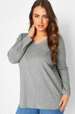 A staple for every wardrobe. Made from a comfortable jersey fabric, this plus-size t-shirt features a v-neckline with long sleeves. Great as a layering piece or paired with jeans and trainers for a casual everyday outfit.