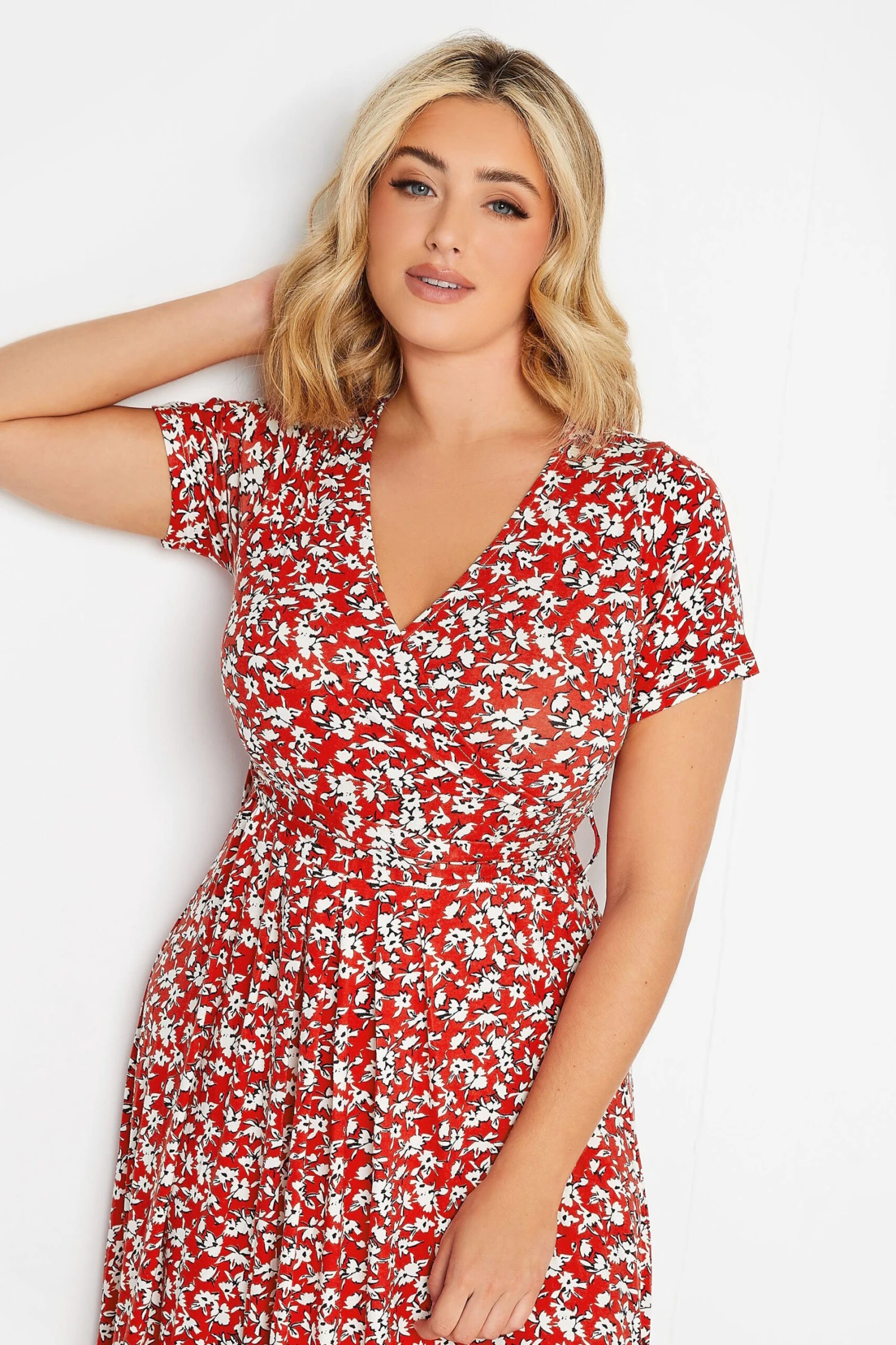 Add floral prints to your wardrobe with this plus-size jersey dress. Made from a comfortable jersey fabric, it features short sleeves, a wrap v-neckline and is complete at a midaxi length with an all-over floral ditsy print. Wear with heels for a must-have summer look.