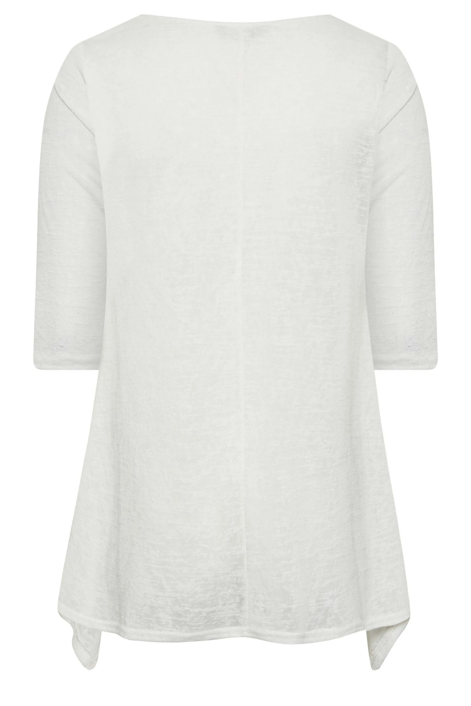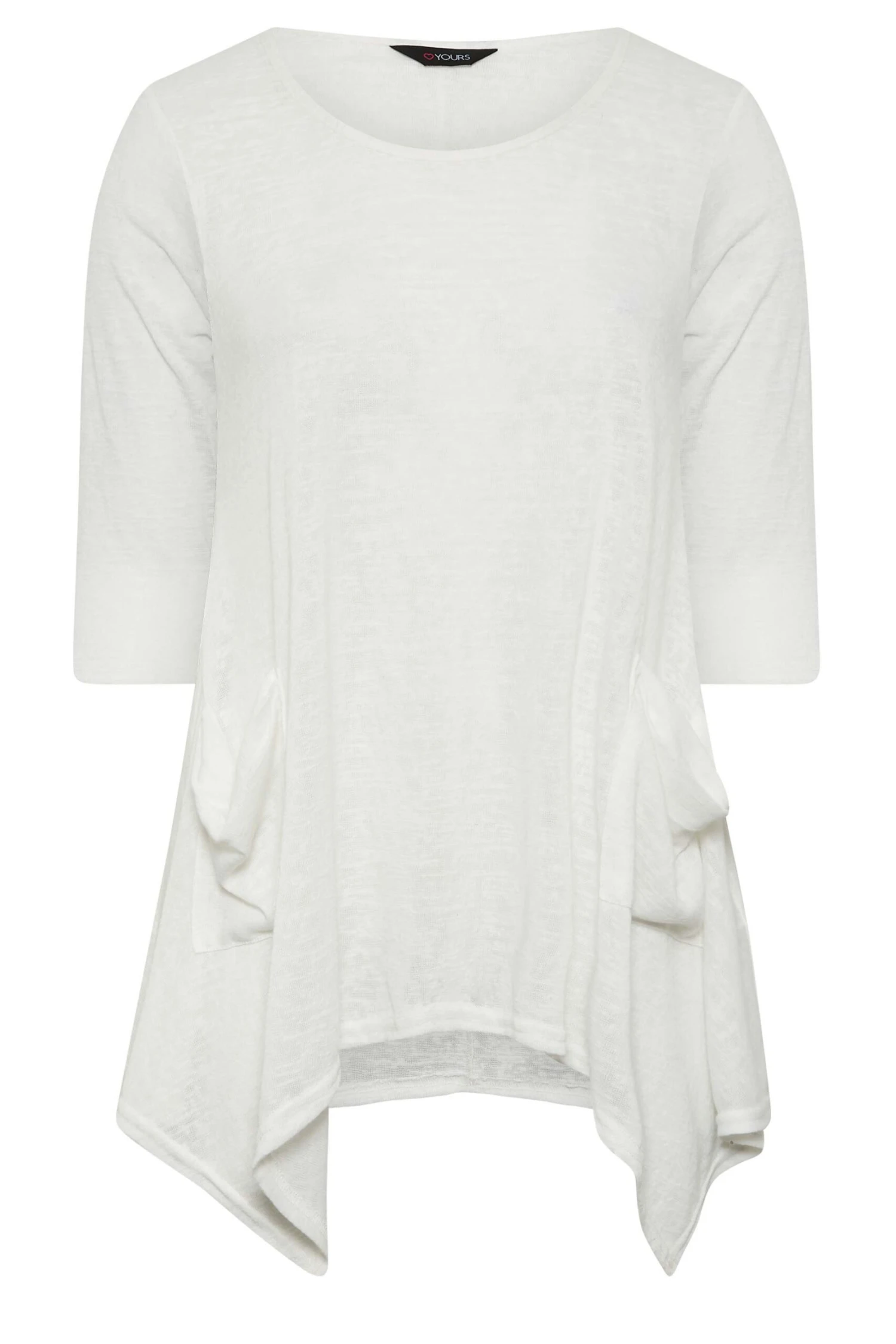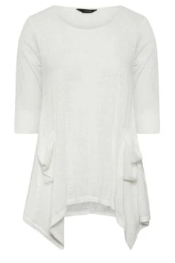 Refresh your wardrobe with this plus size knitted top. Made from a comfortable jersey fabric, it features 3/4 length sleeves, a scoop neckline and two side pockets with a hanky hemline. Layer over a cami top with jeans and trainers for a casual, everyday outfit.
