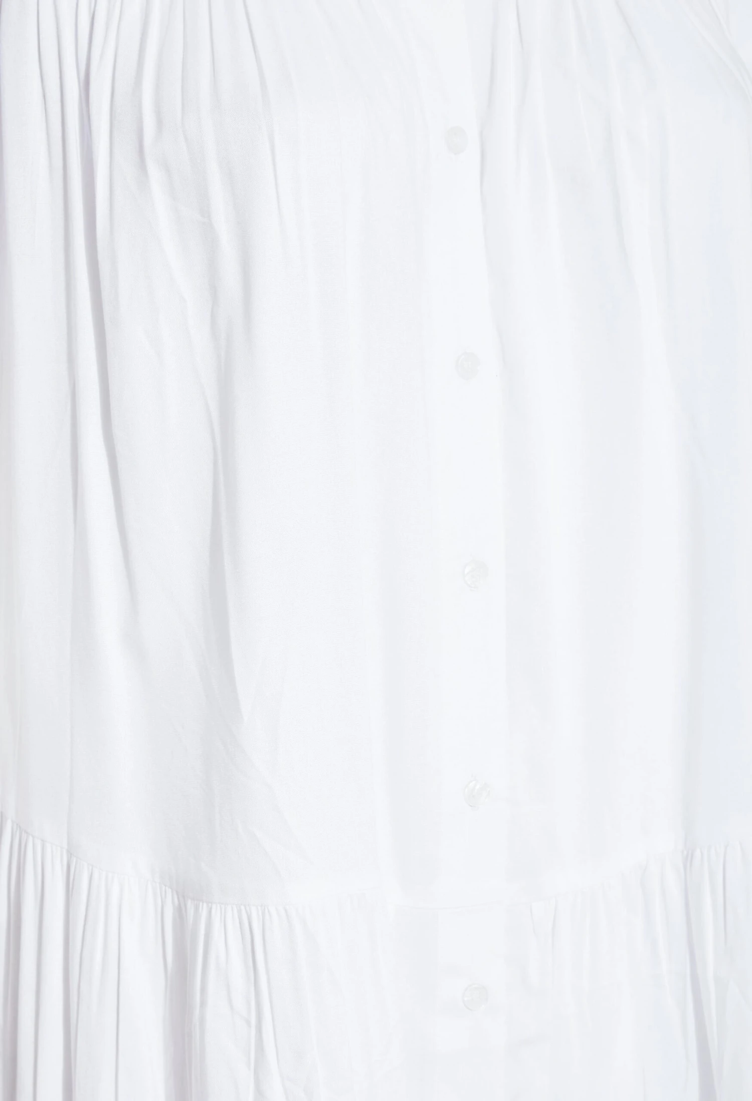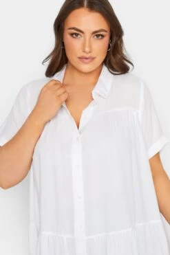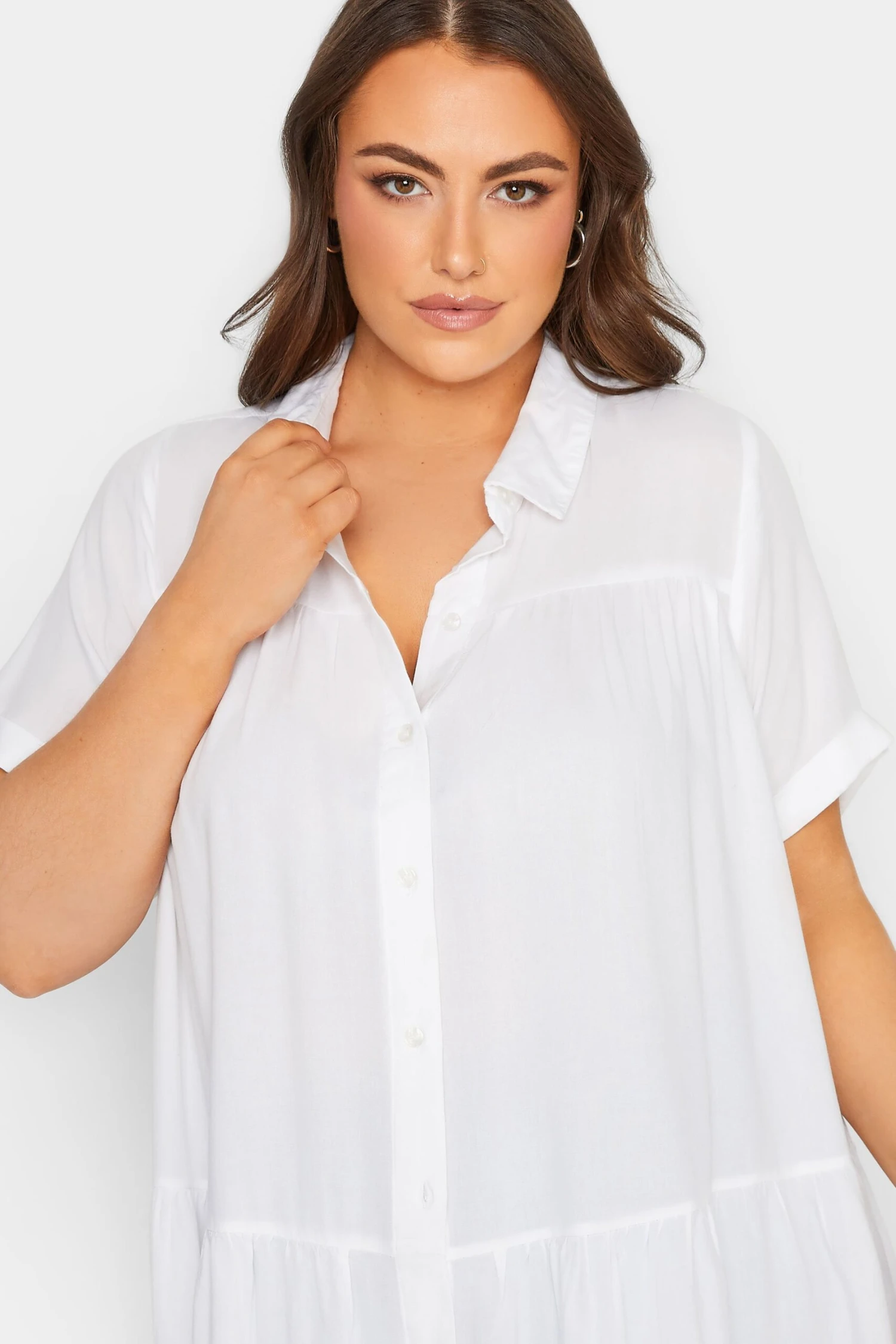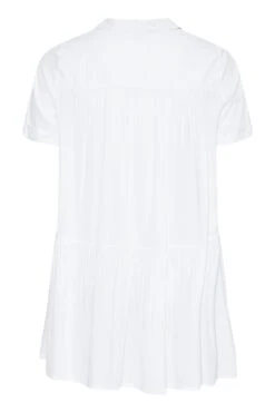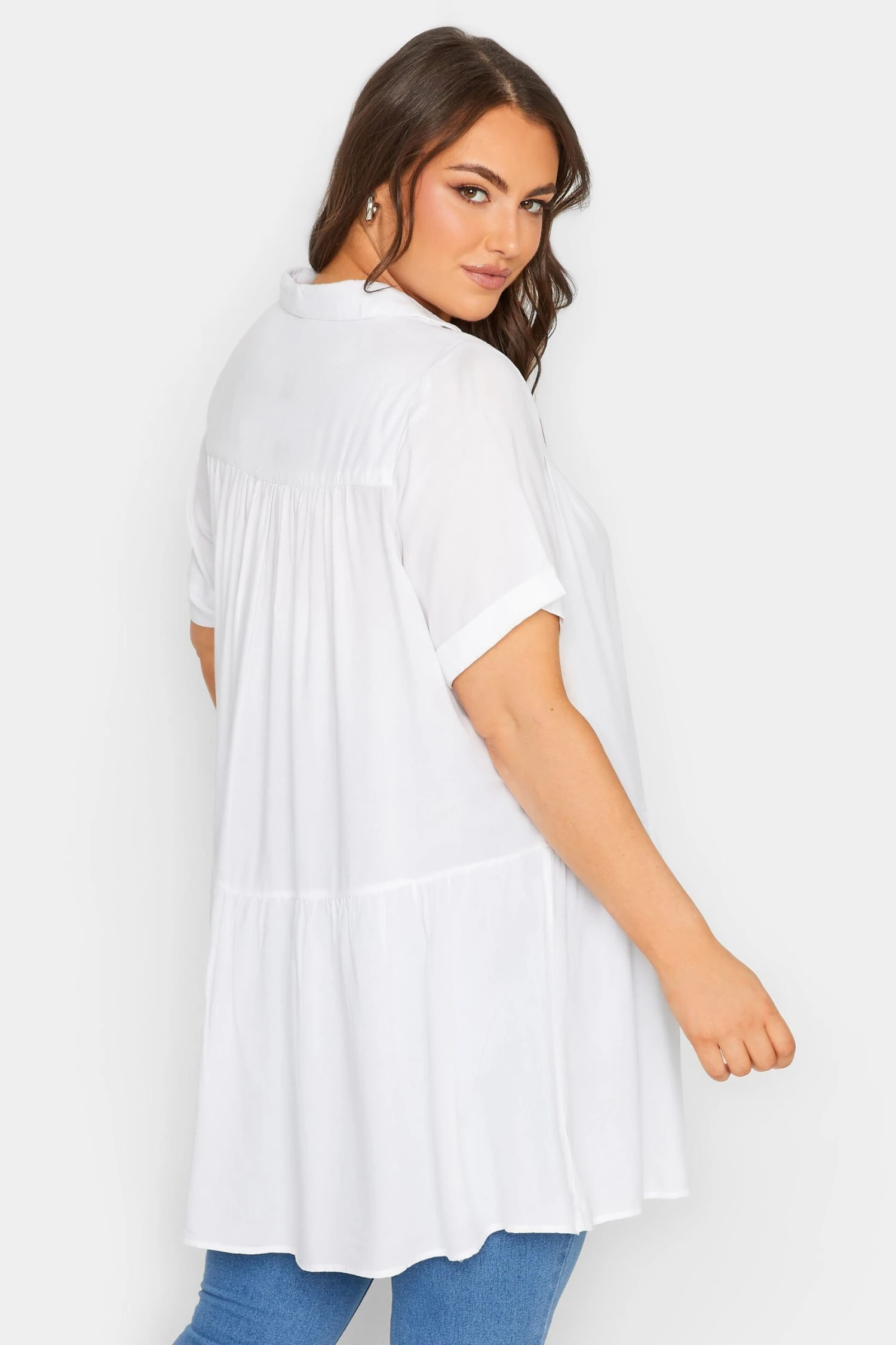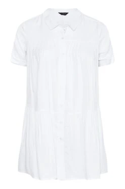 Make some room in your wardrobe for this new-in shirt. Made from a soft woven fabric, this plus size white shirt features short sleeves, a classic collar and is complete in a tiered smock style. Team with jeans and heels for the ultimate jeans and nice top look!